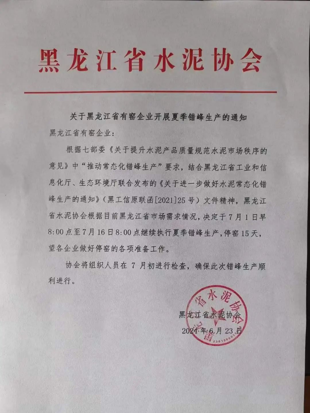 黑龍江省水泥協(xié)會(huì)發(fā)布《關(guān)于黑龍江省有窯企業(yè)開(kāi)展夏季錯(cuò)峰生產(chǎn)的通知》稱(chēng):自7月1日早8點(diǎn)至7月16日8:00點(diǎn)繼續(xù)執(zhí)行夏季錯(cuò)峰生產(chǎn),停窯15天。