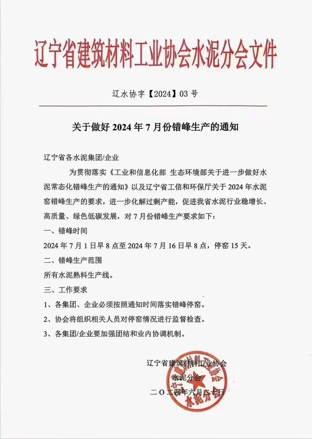 遼寧省建材工業(yè)協(xié)會(huì)水泥分會(huì)發(fā)布《關(guān)于做好2024年7月錯(cuò)峰生產(chǎn)的通知》稱(chēng):遼寧省所有水泥熟料生產(chǎn)線(xiàn)自2024年7月1日早8點(diǎn)至2024年7月16日早8點(diǎn),停窯15天。
