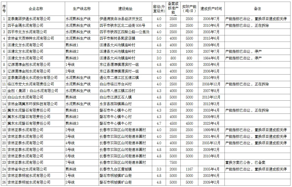 根據(jù)吉林省工信廳發(fā)布的《吉林省水泥熟料生產(chǎn)線(xiàn)清單》,截至到2023年12月31日,吉林省共有16家水泥廠26條水泥熟料生產(chǎn)線(xiàn),其中11條水泥熟料生產(chǎn)線(xiàn)已經(jīng)進(jìn)行了產(chǎn)能置換,2條停產(chǎn),3條正在拆除,其余6條水泥熟料生產(chǎn)線(xiàn)在置換項(xiàng)目建成前關(guān)停。