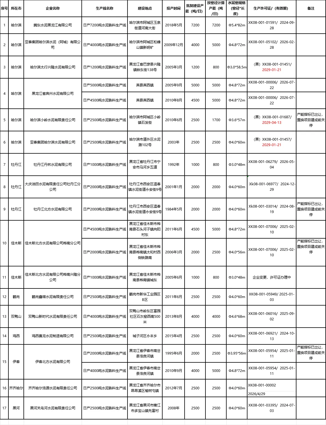 根據(jù)黑龍江省工信廳發(fā)布的《黑龍江省水泥熟料生產(chǎn)線(xiàn)清單》,截至到2023年12月31日,黑龍江省共有17家水泥廠20條水泥熟料生產(chǎn)線(xiàn),其中4條水泥熟料生產(chǎn)線(xiàn)已經(jīng)進(jìn)行了產(chǎn)能置換,在置換項(xiàng)目建成前關(guān)停。