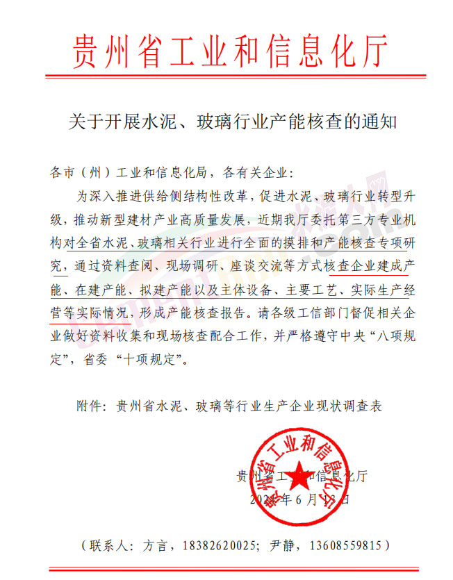 日前,貴州省工信廳發(fā)布《關于開展水泥、玻璃行業(yè)產能核查的通知》給轄區(qū)各市(州)工業(yè)和信息化局,各有關企業(yè)稱,為深入推進供給側結構性改革,促進水泥、玻璃行業(yè)轉型升級,推動新型建材產業(yè)高質量發(fā)展,近期貴州省工信廳廳委托第三方專業(yè)機構對全省水泥、玻璃相關行業(yè)進行全面的摸排和產能核查專項研究,通過資料查閱、現場調研、座談交流等方式核查企業(yè)建成產能、在建產能、擬建產能以及主體設備、主要工藝、實際生產經營等實際情況,形成產能核查報告。請各級工信部門督促相關企業(yè)做好資料收集和現場核查配合工作,并嚴格遵守中央“八項規(guī)定”,省委“十項規(guī)定”。