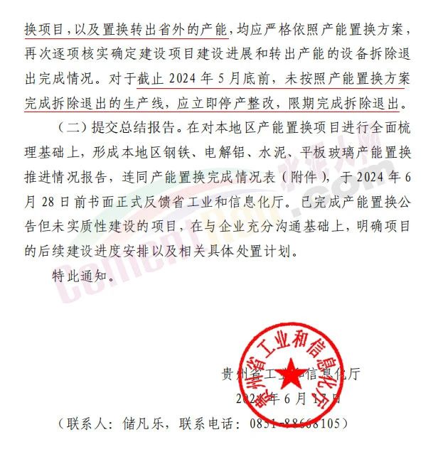 要求涉及產能指標轉入貴州省的產能置換項目,以及置換轉出省外的產能,均應嚴格依照產能置換方案,再次逐項核實確定建設項目建設進展和轉出產能的設備拆除退出完成情況。對于截止2024年5月底前,未按照產能置換方案完成拆除退出的生產線,應立即停產整改,限期完成拆除退出。