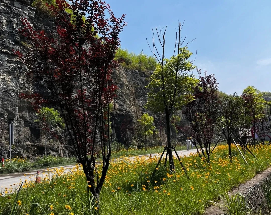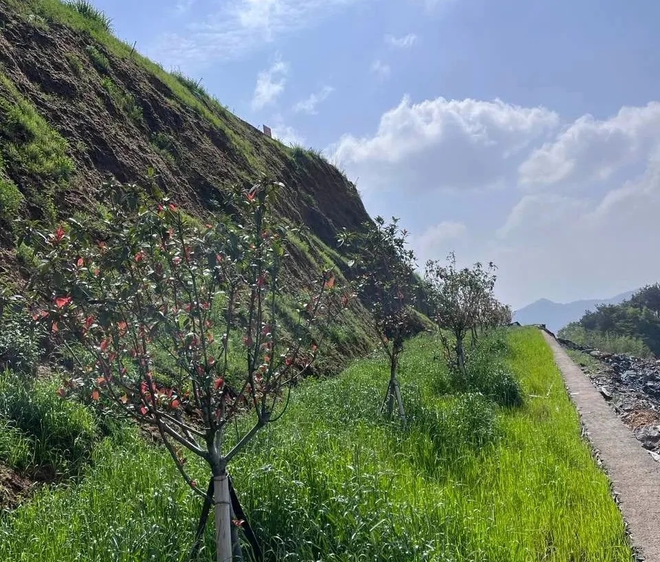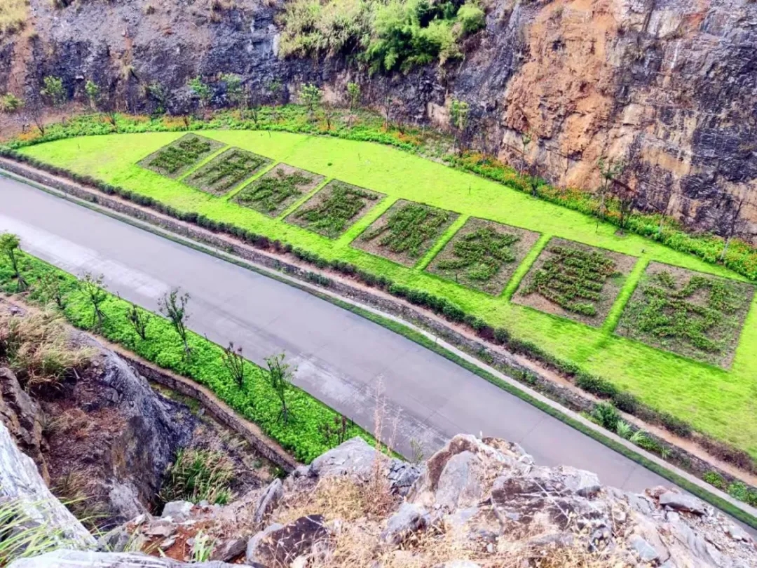 江山分公司秉持邊開采邊治理原則,在最終邊坡處修筑塊石擋墻,擋墻內(nèi)覆土并人工播撒草灌,種植紅葉石楠,邊坡坡面采用掛網(wǎng)噴漿的方式噴撒草籽。修筑蓄水池連接礦山水泵房,坡面上架設(shè)噴淋管道,方便后期養(yǎng)護用水,邊坡外圍修建臺階及防護欄與上層平臺相連。將系統(tǒng)觀念貫穿生態(tài)文明建設(shè)全過程,注重科學(xué)運用和實踐深化,堅持綜合治理、系統(tǒng)治理、源頭治理。