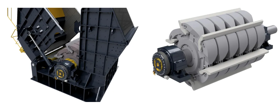 HPI破碎機(jī)有兩個反擊板,也可以配備研磨架。轉(zhuǎn)子能夠處理高達(dá)3m³的進(jìn)料,研磨路徑限制了超大產(chǎn)品的數(shù)量。反擊板和磨削架的間隙設(shè)置可以通過主軸進(jìn)行調(diào)整,也可以通過液壓控制,并允許對最終產(chǎn)品的粒度進(jìn)行最佳控制。其中,轉(zhuǎn)子是破碎過程中的關(guān)鍵部件。其主體與軸和軸承一起構(gòu)成了反擊式破碎機(jī)的“心臟”。
