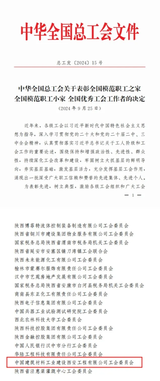 近日,中華全國總工會下發(fā)《中華全國總工會關(guān)于表彰全國模范職工之家、全國模范職工小家、全國優(yōu)秀工會工作者的決定》,中材礦山所屬中國建筑材料工業(yè)建設(shè)西安工程有限公司工會(以下簡稱西安公司工會)榮獲“全國模范職工之家”榮譽稱號。此殊榮是全國工會系統(tǒng)表彰先進(jìn)集體的最高榮譽,是對基層工會工作的高度褒獎和肯定。