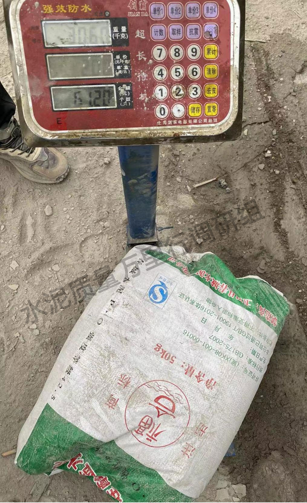 標(biāo)稱生產(chǎn)企業(yè)為玉田縣春城水泥廠的“福合”牌PO42.5(50kg)水泥,實(shí)際稱重為30.6kg。