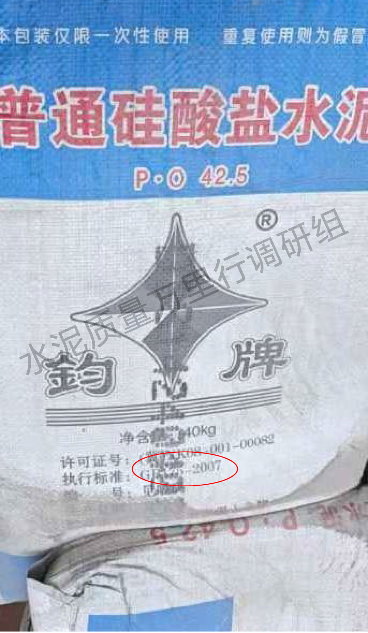 上面這些尚有據(jù)可查,還有部分“三無(wú)產(chǎn)品”——無(wú)生產(chǎn)日期、無(wú)生產(chǎn)廠家、無(wú)生產(chǎn)許可證號(hào)或生產(chǎn)許可證號(hào)和標(biāo)稱廠家查無(wú)此廠的情況。此類(lèi)產(chǎn)品分布在北京市多個(gè)區(qū)縣,日銷(xiāo)量百余噸。此外,還有包裝袋印刷相關(guān)信息錯(cuò)亂情況,屢見(jiàn)不鮮,如:標(biāo)稱為“鈞牌”P.O42.5水泥的執(zhí)行標(biāo)準(zhǔn)引用過(guò)期水泥標(biāo)準(zhǔn)GB175-2007。
