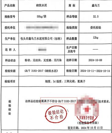 標稱為包頭市鑫烏蘭水泥有限公司生產(chǎn)的一批次“鑫烏蘭”牌,砌筑M32.5水泥氯離子含量0.18%,較標準要求高出3倍,不符合標準要求,檢驗結(jié)論為不合格。