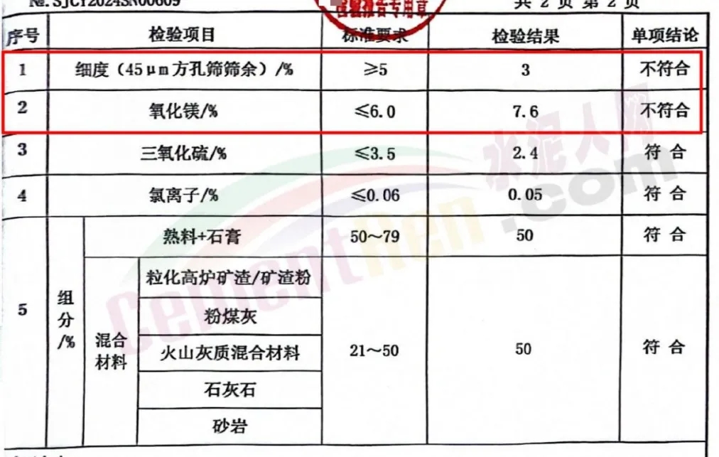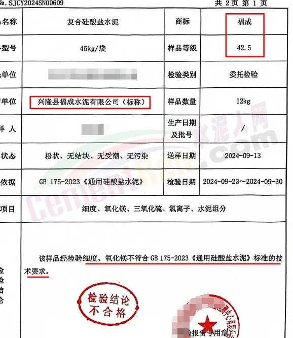 同期發(fā)現(xiàn)的標稱為興隆縣福成水泥有限公司生產(chǎn)的“福成”牌P.C42.5水泥一批次細度和氧化鎂項目與標準要求不符。