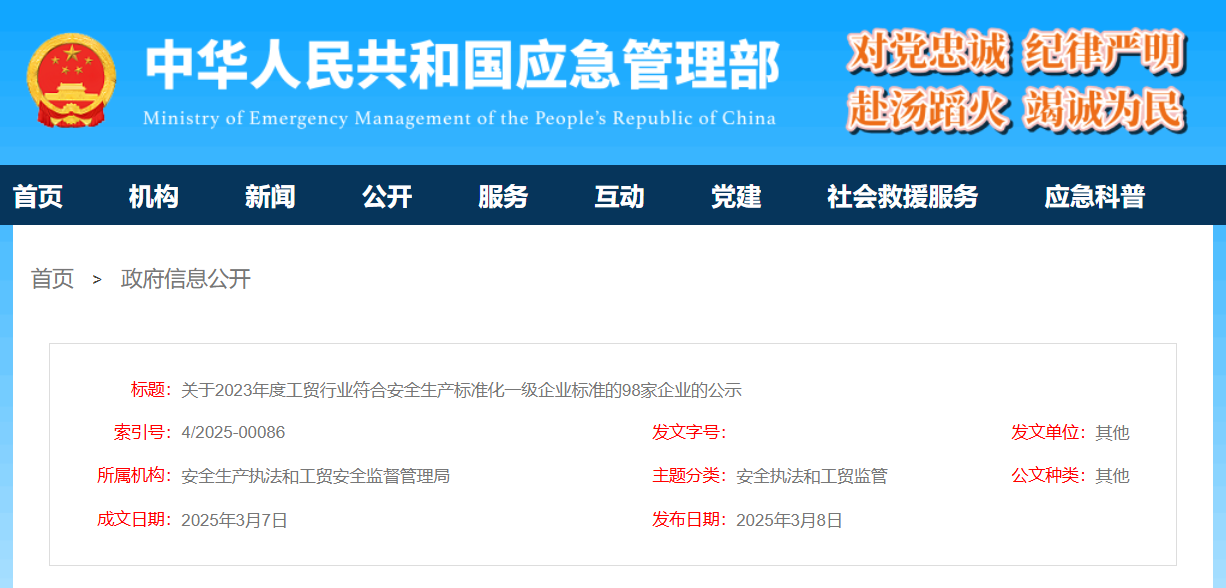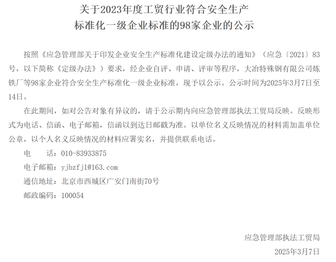 日前,應急管理部發(fā)布關于2023年度工貿行業(yè)符合安全生產標準化一級企業(yè)標準的98家企業(yè)的公示稱,按照《應急管理部關于印發(fā)企業(yè)安全生產標準化建設定級辦法的通知》(應急〔2021〕83號,以下簡稱《定級辦法》)要求,經企業(yè)自評、申請、評審等程序,大冶特殊鋼有限公司煉鐵廠等98家企業(yè)符合安全生產標準化一級企業(yè)標準,現(xiàn)予以公示。公示時間為2025年3月7日至14日。