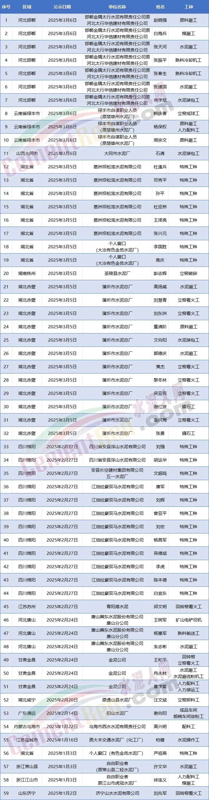 近日,各地人力資源和社會保障局陸續(xù)公示了一批水泥企業(yè)職工的特殊工種提前退休名單。從河北邯鄲到云南祿豐,從湖北赤壁到四川綿陽,這份名單覆蓋全國十余個省市,涉及近60名職工。他們中,有人從事立窯看火工長達15年,有人在高溫粉塵環(huán)境中堅守超過10年,還有人因繁重體力勞動落下終身病痛。這份名單不僅是一份政策執(zhí)行的記錄,更折射出水泥行業(yè)一線從業(yè)者的職業(yè)健康困境。