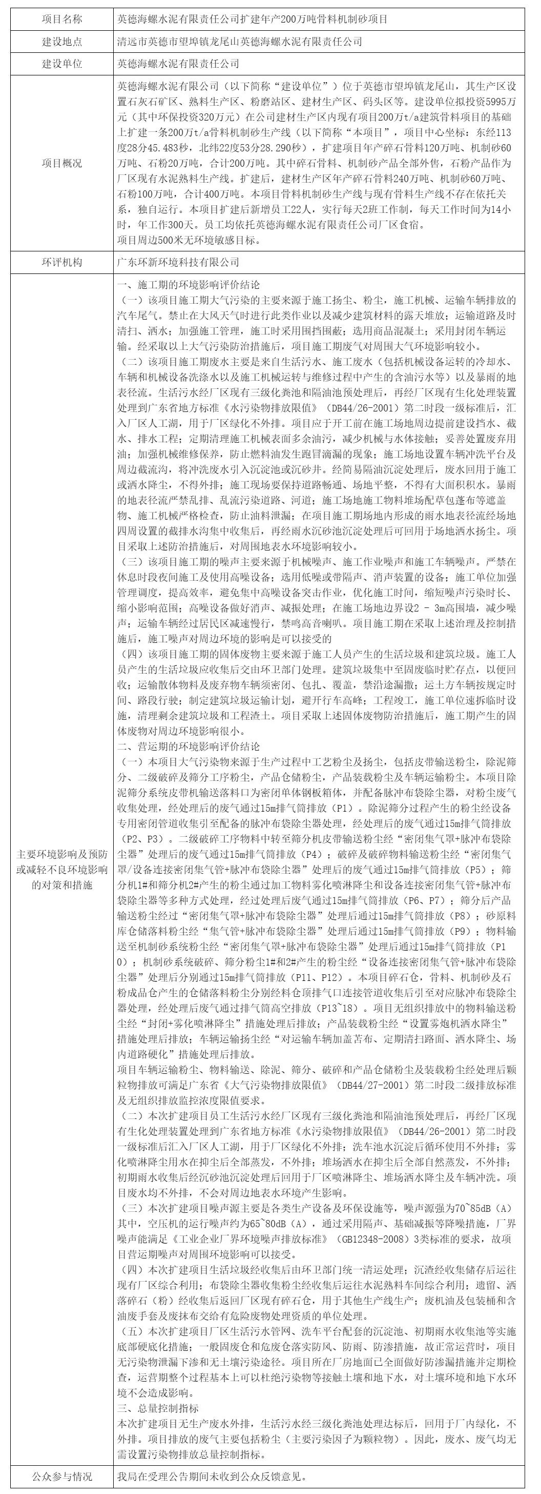 同日發(fā)布擬對英德海螺水泥有限責任公司擴建年產(chǎn)200萬噸骨料機制砂項目環(huán)境影響評價文件作出批準決定的公示稱,根據(jù)英德海螺水泥有限責任公司擴建年產(chǎn)200萬噸骨料機制砂項目環(huán)境影響評價文件、技術(shù)評估報告等,按照建設(shè)項目環(huán)境影響評價審批程序的有關(guān)規(guī)定,審批機構(gòu)擬對該項目環(huán)境影響評價文件作出批準決定。為體現(xiàn)公開、公正的原則,強化公眾參與,現(xiàn)予公示。