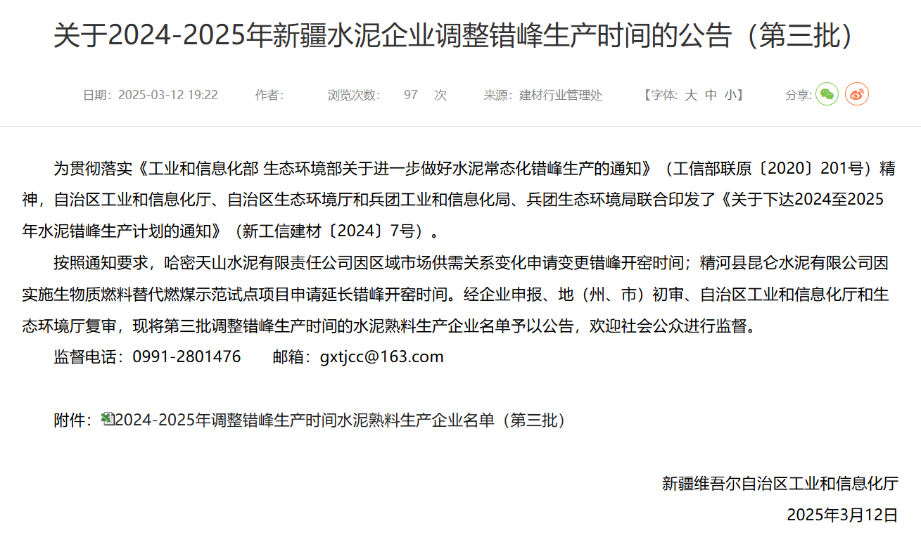 3月12日,新疆自治區(qū)工信廳發(fā)布第三批關(guān)于2024-2025年新疆水泥企業(yè)調(diào)整錯(cuò)峰生產(chǎn)時(shí)間的公告稱,按照通知要求,哈密天山水泥有限責(zé)任公司因區(qū)域市場供需關(guān)系變化申請變更錯(cuò)峰開窯時(shí)間;精河縣昆侖水泥有限公司因?qū)嵤┥镔|(zhì)燃料替代燃煤示范試點(diǎn)項(xiàng)目申請延長錯(cuò)峰開窯時(shí)間。