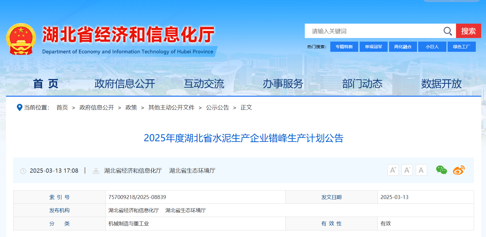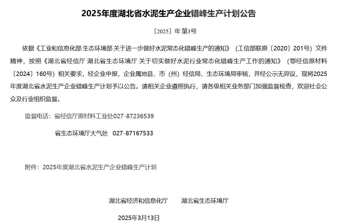 同日,湖北省經(jīng)信廳發(fā)布《2025年度湖北省水泥生產(chǎn)企業(yè)錯(cuò)峰生產(chǎn)計(jì)劃公告》稱,依據(jù)《工業(yè)和信息化部生態(tài)環(huán)境部關(guān)于進(jìn)一步做好水泥常態(tài)化錯(cuò)峰生產(chǎn)的通知》(工信部聯(lián)原〔2020〕201號(hào))文件精神,按照《湖北省經(jīng)信廳湖北省生態(tài)環(huán)境廳關(guān)于切實(shí)做好水泥行業(yè)常態(tài)化錯(cuò)峰生產(chǎn)工作的通知》(鄂經(jīng)信原材料〔2024〕160號(hào))相關(guān)要求,經(jīng)企業(yè)申報(bào),企業(yè)屬地縣、市(州)經(jīng)信局、生態(tài)環(huán)境局審核,并經(jīng)公示無異議,現(xiàn)將2025年度湖北省水泥生產(chǎn)企業(yè)錯(cuò)峰生產(chǎn)計(jì)劃予以公告。請相關(guān)企業(yè)遵照執(zhí)行,請各級(jí)相關(guān)業(yè)務(wù)部門加強(qiáng)監(jiān)督檢查,歡迎社會(huì)公眾及行業(yè)組織監(jiān)督。