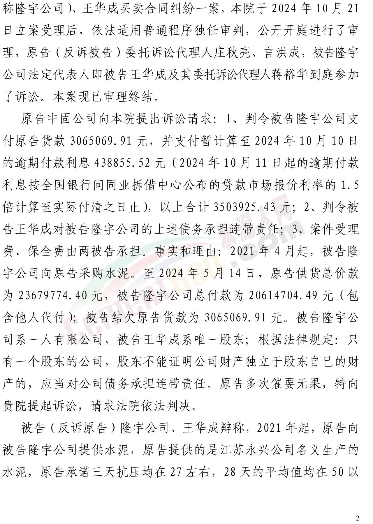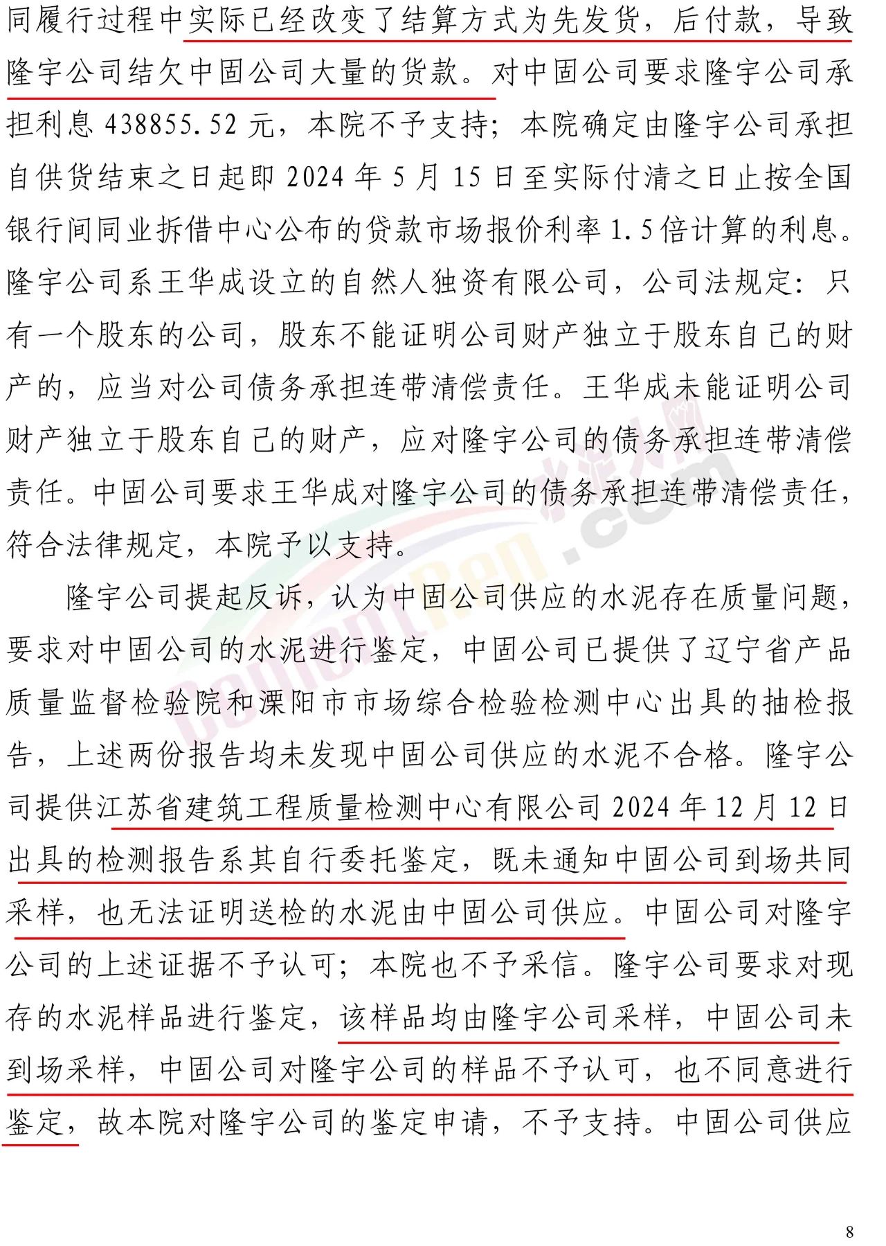 法院還駁斥了隆宇公司關(guān)于其下游混凝土質(zhì)量問題系由中固水泥造成的核心邏輯:“混凝土系由水泥、黃沙、石子、水和添加劑等各種其他材料按比例混合而成,不能僅因隆宇公司向他人供應(yīng)的混凝土存在質(zhì)量問題,就直接推定中固公司供應(yīng)的水泥存在質(zhì)量問題。”法院認為,隆宇公司的反訴請求與事實不符,缺乏充分、合法、有效的證據(jù)鏈支撐。