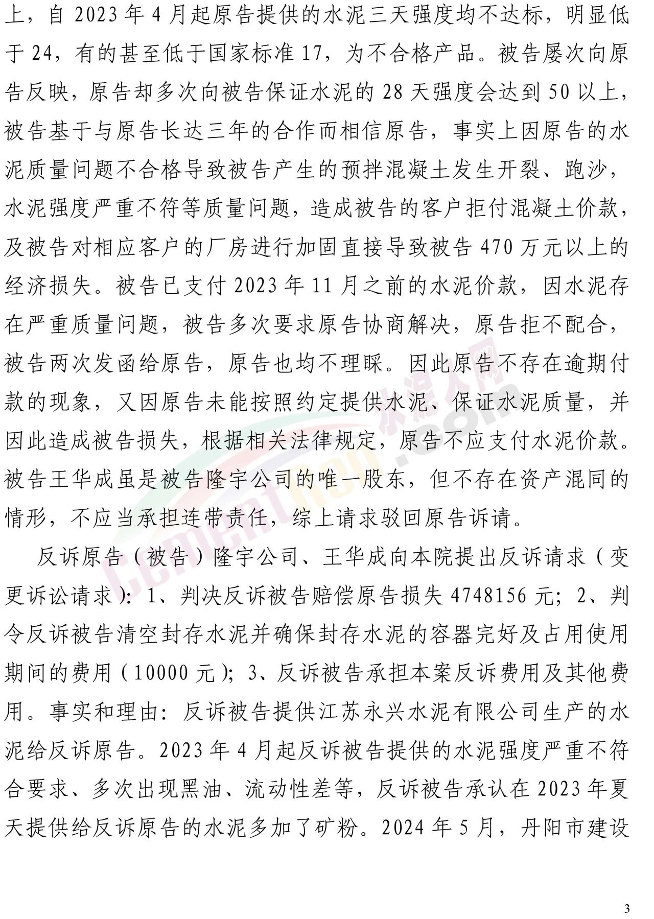 隆宇公司則提起反訴,堅稱中固公司供應(yīng)的水泥存在嚴重質(zhì)量問題(氯離子超標、強度不足),并提供了自己委托江蘇省建筑工程質(zhì)量檢測中心有限公司于2024年12月12日出具的檢測報告作為核心證據(jù)。然而,這份報告成為其敗訴的關(guān)鍵伏筆。