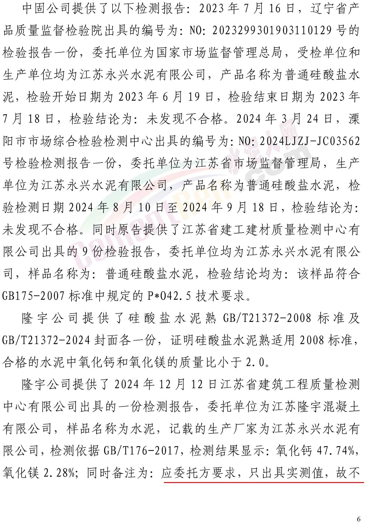 當中固公司已主動提供了兩份權(quán)威抽檢報告——遼寧省產(chǎn)品質(zhì)量監(jiān)督檢驗院和溧陽市市場綜合檢驗檢測中心出具的抽檢報告(均顯示其供應(yīng)水泥合格)時,隆宇公司單方委托且程序存疑的報告更顯蒼白無力。
