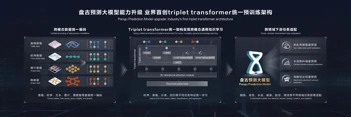 本次盤(pán)古預(yù)測(cè)大模型的關(guān)鍵升級(jí)點(diǎn)是,采用業(yè)界首創(chuàng)的triplet transformer統(tǒng)一預(yù)訓(xùn)練架構(gòu),將不同行業(yè)的數(shù)據(jù),包括工藝參數(shù)的表格數(shù)據(jù),設(shè)備運(yùn)行日志的時(shí)間序列數(shù)據(jù),產(chǎn)品檢測(cè)的圖片數(shù)據(jù)進(jìn)行統(tǒng)一的三元組編碼,并在同一框架內(nèi)高效處理和預(yù)訓(xùn)練,極大地提升預(yù)測(cè)大模型的精度,并大幅提升跨行業(yè)、跨場(chǎng)景的泛化性。