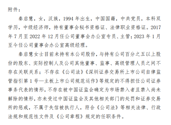 其簡(jiǎn)歷顯示:秦啟慧,女,漢族,1994年出生,中國(guó)國(guó)籍,中共黨員,本科雙學(xué)歷,中級(jí)經(jīng)濟(jì)師,持有董事會(huì)秘書(shū)資格證、法律職業(yè)資格證。2017年7月至2022年12月任公司董事會(huì)辦公室專(zhuān)員、主管;2023年1月至今任公司董事會(huì)辦公室高級(jí)經(jīng)理。