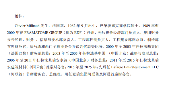 6月25日,華新水泥發(fā)布公告稱(chēng),經(jīng)公司董事會(huì)會(huì)議審議并投票表決,選舉Olivier Milhaud為公司第十一屆董事會(huì)董事,任期與本屆董事會(huì)一致。根據(jù)公告,Olivier Milhaud,法國(guó)籍,1962年9月出生,巴黎埃塞克商學(xué)院碩士。