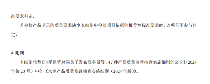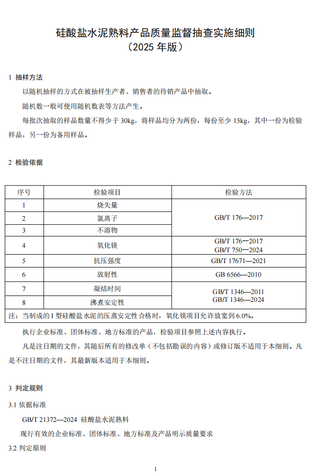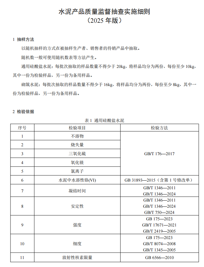 水泥人網(wǎng)注意到,市場(chǎng)監(jiān)管總局同期發(fā)布的還有水泥及熟料產(chǎn)品2025版產(chǎn)品質(zhì)量監(jiān)督抽查實(shí)施細(xì)則公告,并表示自發(fā)布之日起實(shí)施,各地市場(chǎng)監(jiān)管部門在開展產(chǎn)品質(zhì)量監(jiān)督抽查時(shí)可直接采用。此前發(fā)布的同種產(chǎn)品監(jiān)督抽查實(shí)施細(xì)則同時(shí)廢止。