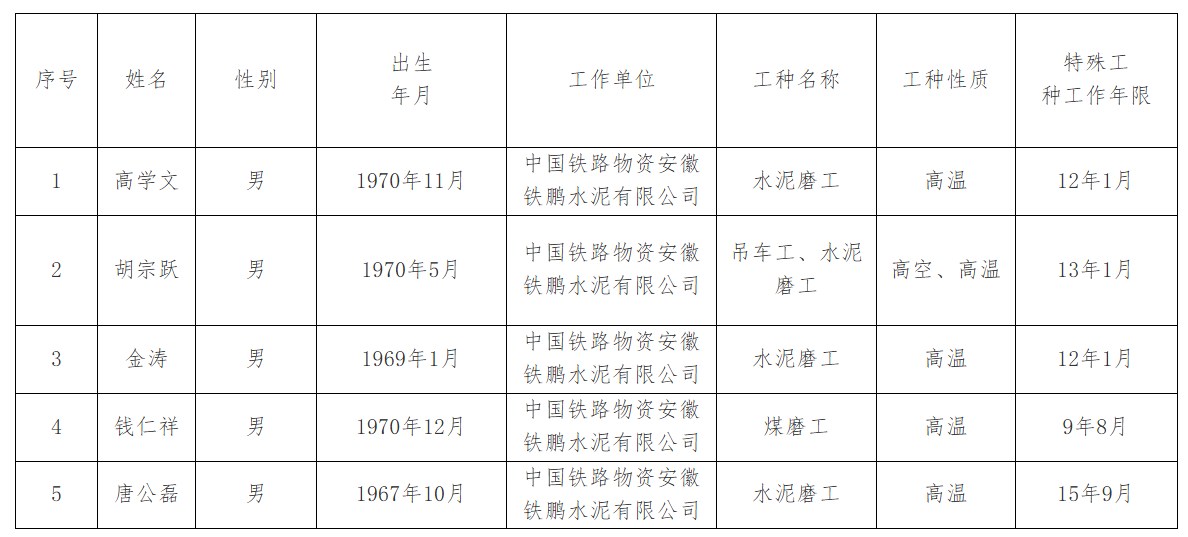 日前,安徽省人力資源和社會保障廳發(fā)布《中國鐵路物資安徽鐵鵬水泥有限公司2025年特殊工種提前退休人員公示》。水泥人網(wǎng)注意到,提前退休人員名單中包含中國鐵路物資安徽鐵鵬水泥有限公司5名職工,其工種涉及水泥磨工、吊車工及煤磨工竺產(chǎn),工種性質(zhì)分別涉及高溫和高空。特殊工種工作年限從9年8月至15年9月不等。詳情如下: